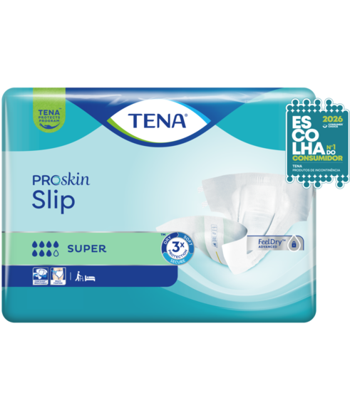 TENA Slip Super é uma fralda para incontinência com fitas aderentes ajustáveis para um ajuste perfeito, conforto e proteção contra perdas. Ao contrário de muitas fraldas para adultos normais, TENA ProSkin Slip possui um material suave semelhante a tecido, ajuste adequado ao corpo, elevada segurança contra perdas e é ideal para alguém com menor mobilidade ou para mudar na cama. Graças à funcionalidade FeelDry Advanced™, o produto afasta rapidamente o líquido da superfície, mantendo a pele seca. O núcleo de absorção rápida bloqueia rapidamente a urina, mesmo em maiores quantidades, para que se sinta seco, e a camada inferior totalmente respirável ConfioAir™ permite que a pele respire. Todas estas características ajudam a preservar a saúde natural da pele. O design aberto com fitas aderentes fortes permite uma mudança fácil estando sentado ou deitado, sendo que estas podem ser facilmente apertadas e ajustadas para um ajuste perfeito e seguro. Para uma maior frescura, o produto apresenta um neutralizador de odores e um indicador de humidade, que indica quando é o momento de mudar.