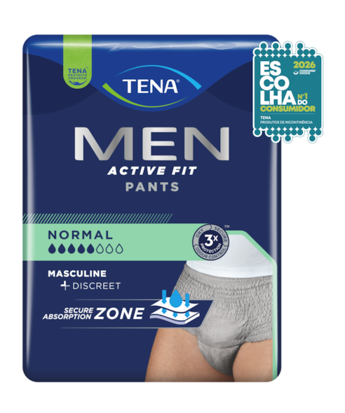 Mantenha o controlo de perdas de urina moderadas com as TENA Men Active Fit Pants Normal. Estas cuecas confortáveis em cinzento parecem roupa interior normal, com um corte masculino, cintura elástica e um toque de algodão respirável. Esta roupa interior para incontinência masculina tem um ajuste discreto e seguro. A Zona de Absorção Segura retém efetivamente as perdas e tem a garantia da tripla proteção contra perdas, odor e humidade. Não comprometa a sensação de confiança – mantenha o controlo no trabalho, no ginásio ou onde quer que vá, a qualquer hora do dia.