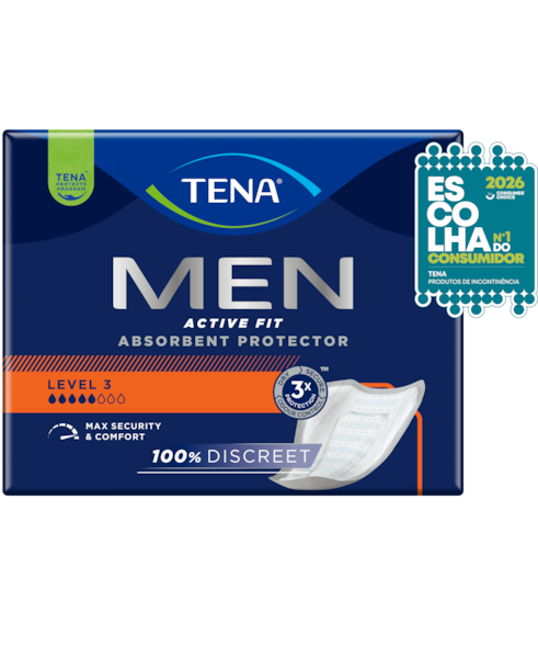 O protetor absorvente TENA Men Active Fit Nível 3 é o nosso penso mais absorvente para uma proteção eficaz contra perdas de urina intensas e picos maiores. Experimente a tripla proteção contra perdas de urina, odores e humidade, para segurança e conforto máximos. Com um Núcleo Duplo para maior absorção, estes pensos têm apenas 10 mm de espessura, são discretos e confortáveis de usar com um macio formato em concha para se moldar ao seu corpo. Basta remover a embalagem individual e colar o absorvente na sua roupa íntima usando a fita adesiva. Vai esquecer-se de que está a usá-lo, para se sentir revigorado, assumir o controlo e voltar a fazer o que faz de melhor.