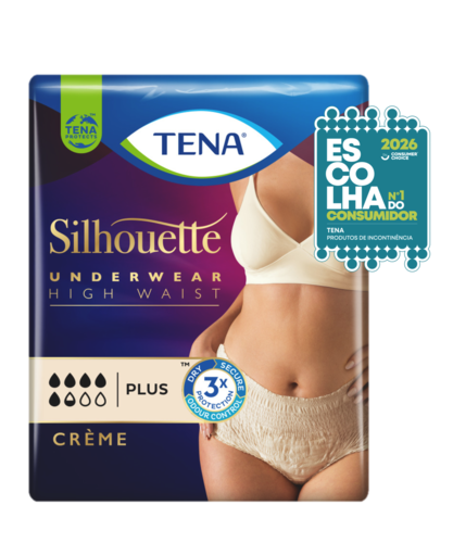 Cuecas para incontinência elegantes e discretas para mulheres. As cuecas TENA Silhouette Plus Cintura Alta proporcionam proteção total contra perdas de urina moderadas a intensas. Ideal para mulheres após o parto.